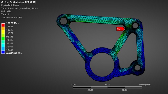 After fine-tuning the bellcrank, reducing stress concentrations resulting from the force cases, I finalized the bellcranks with an overall reduction of weight by 56.7% while increasing the safety factor from 1.5 to 2.8, also reducing cost. For my full write-up and for more information on how suspension parameters were determined, see the document linked below.