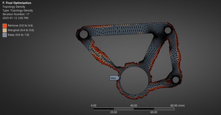 From the above constraints, along with our determined optimal values for our ride frequency & spring rates, I determined the geometry and optimized the bellcranks from there. I ran multiple topology optimizations in ANSYS to optimize the strength-weight ratio based on the two different force cases this component sees, aiming for a safety factor > 2.
